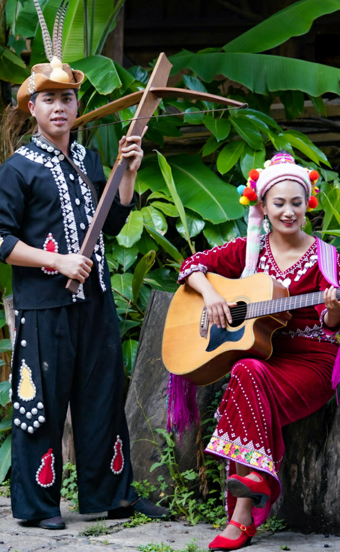 拉祜族人口約41萬(wàn),主要聚居在思茅、臨滄境內(nèi)的瀾滄江沿岸地區(qū)。拉祜族寨與基諾族寨緊緊毗連,寨內(nèi)建有拉祜族茅草房、大公房、教堂、牛棚以及葫蘆廣場(chǎng)。位于拉祜族寨中心位置的葫蘆廣場(chǎng)形似一只碩大的葫蘆平面,核心有一組石雕葫蘆。傳說(shuō)拉祜族的祖先誕生于葫蘆中,因此葫蘆廣場(chǎng)表現(xiàn)了拉祜族的祖先崇拜觀念。漫步拉祜族寨,葫蘆笙悠揚(yáng)婉轉(zhuǎn)、口弦聲余音繞梁,表現(xiàn)拉祜族勞動(dòng)場(chǎng)面的“豐收擺舞”充滿歡騰和激情,展示了拉祜族的民間...